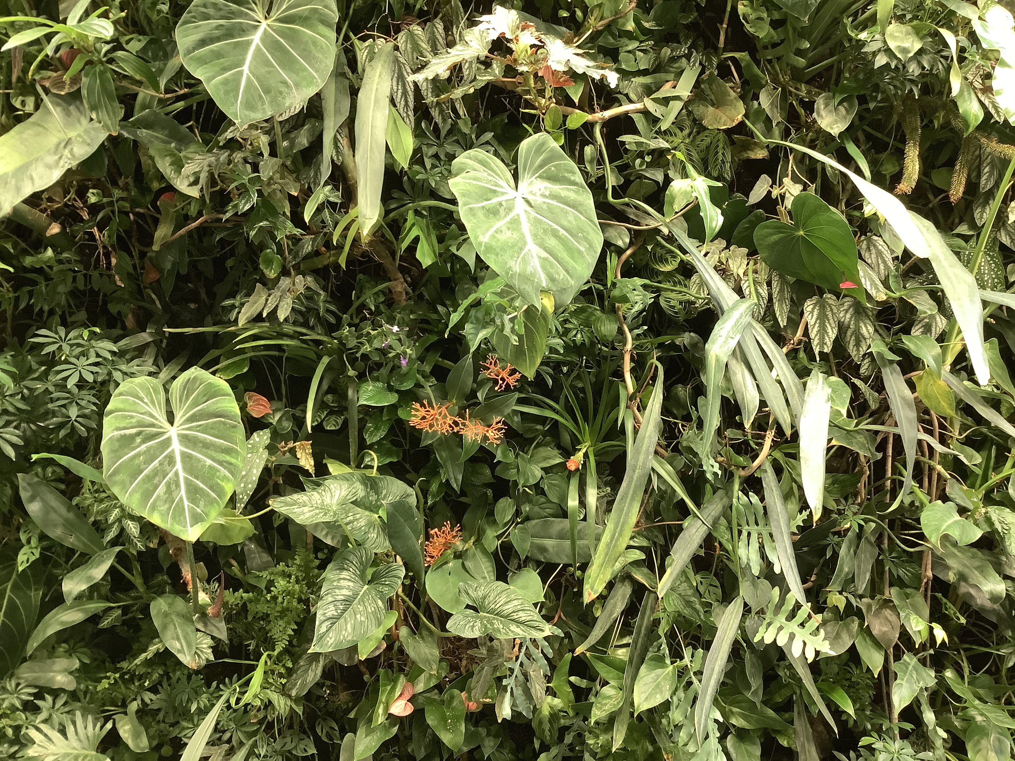 “There are over 250 species of epiphytic plants (those that grow on tree branches rather than in soil in nature) on the living walls. Behind the plants is a mesh textile made out of microfiber that wicks water easily, enabling them to have a very simple irrigation system.“